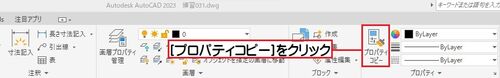 5-1-4 図形の画層をコピーする プロパティコピーコマンドを選択する [ホーム]タブ-[プロパティ]パネル-[プロパティコピー]をクリックする。 プロパティコピーコマンドが実行され、プロンプトに「コピー元オブジェクトを選択」と表示される。 コピー元の寸…