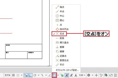 6-4-3 壁芯の長さを調節する オブジェクトスナップを設定する [交点]を設定し、オブジェクトスナップをオンにする。 現在画層を設定する [ホーム]タブ-[画層]パネル-[画層]コントロールをクリックし。「04-文字寸法」を選択する。 長方形コマンドを選択す…