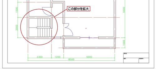 6-13-1 階段の記号を作図する 処理する場所を拡大する マウスのスクロールボタンなどで上図の場所を拡大する。 現在画層を設定する [ホーム]タブ-[画層]パネル-[画層]コントロールをクリックし「04-寸法文字」を選択する。 記号の線を作図する 直交モード…