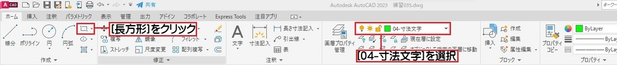[ホーム]タブ-[画層]パネル-[画層]コントロールをクリックし。「04-文字寸法」を選択する。